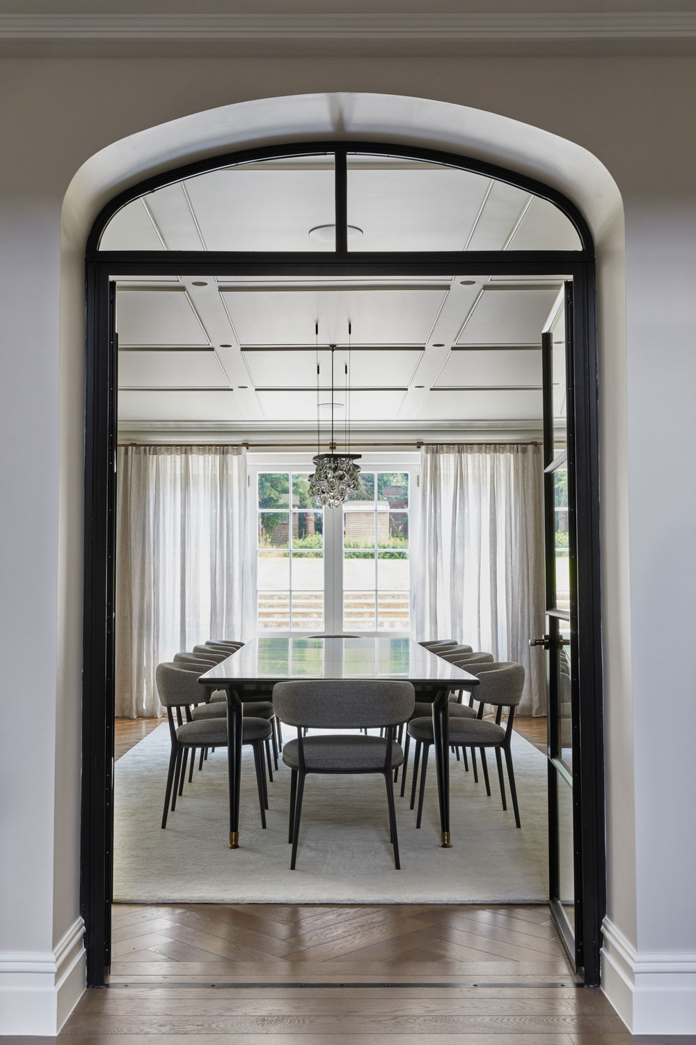 In the formal dining area, full-height curtains in a subtly textured fabric frame the large windows, softening natural light and enhancing the symmetry of the room. The understated palette complements the elegant lines of the dining furniture, setting a serene tone for both intimate dinners and grand entertaining.