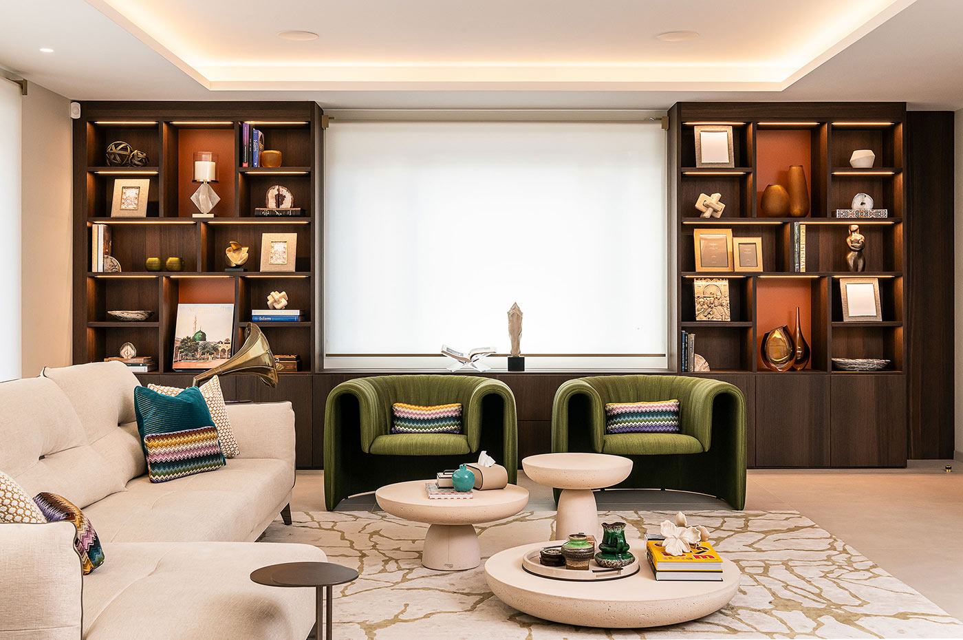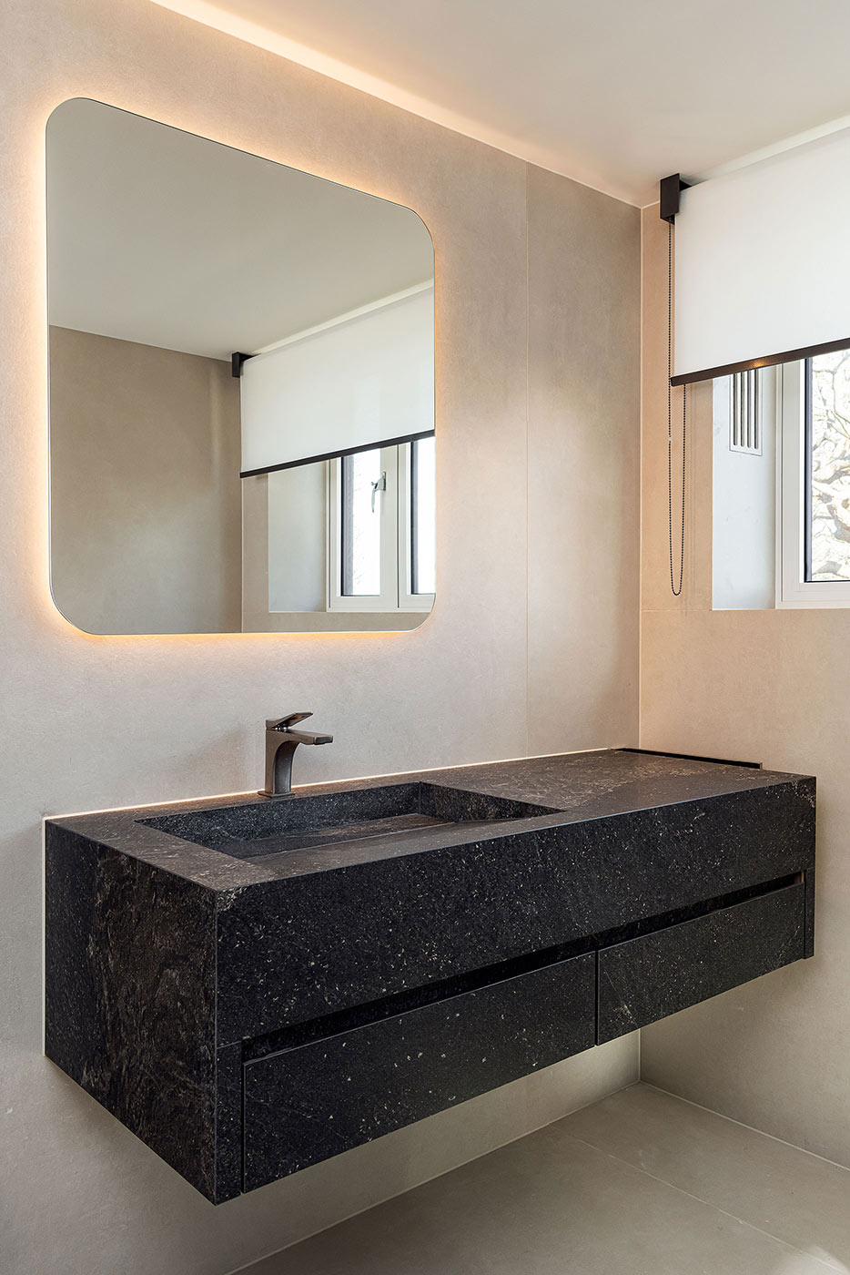 In a home so defined by subtle contrasts and considered textures, the role of window treatments cannot be overstated. These roller blinds, enhanced by their gold detailing, complete each space with elegance and precision. They represent our commitment to providing bespoke solutions that respond to both architectural vision and functional need, particularly within the context of richly layered, culturally informed interiors.
