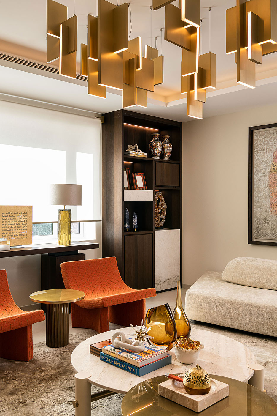 This elegant Middle Eastern-inspired home combines sculptural furniture, warm textures and refined materials. Our bespoke luxury blinds – fitted with understated gold hardware – were selected to harmonise effortlessly with the interior, delivering modern Middle Eastern style window treatments that balance privacy, light control and refined simplicity.