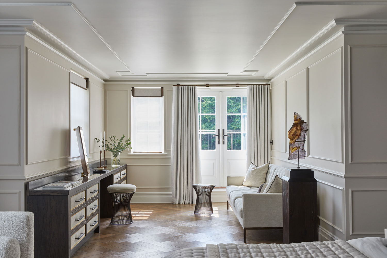 In the bedroom suite, curtains and sheers are layered for depth and privacy. The neutral tones work in harmony with the soft panelling and herringbone flooring, echoing the sense of calm and restraint found throughout the house. Roller blinds are used in bathrooms and dressing areas, where clean lines and practical elegance are essential.