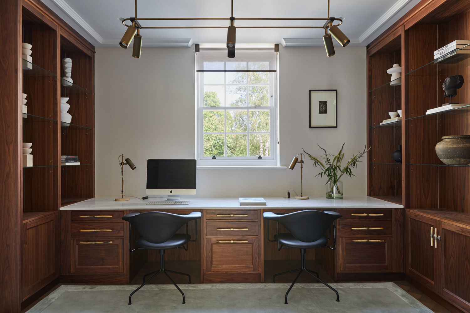 The home office features discreet roller blinds, carefully measured to sit flush within the window frames. These prime property window treatments provide optimal control of natural light, ideal for focused work while maintaining a connection with the outdoors. The result is a work space that feels as sophisticated as it is functional.