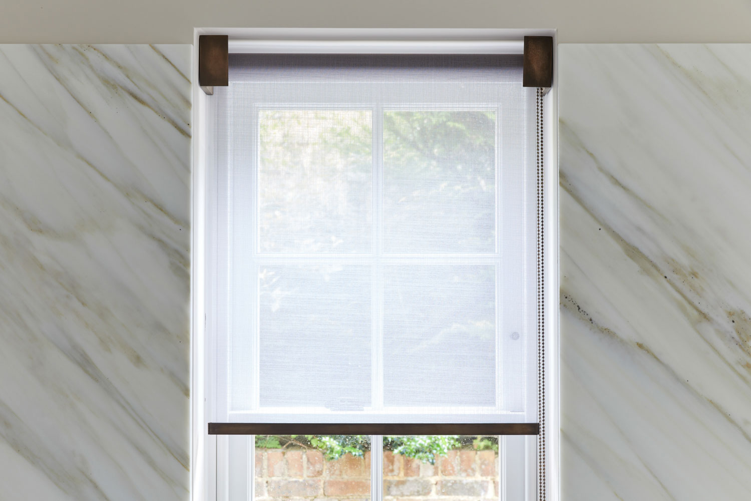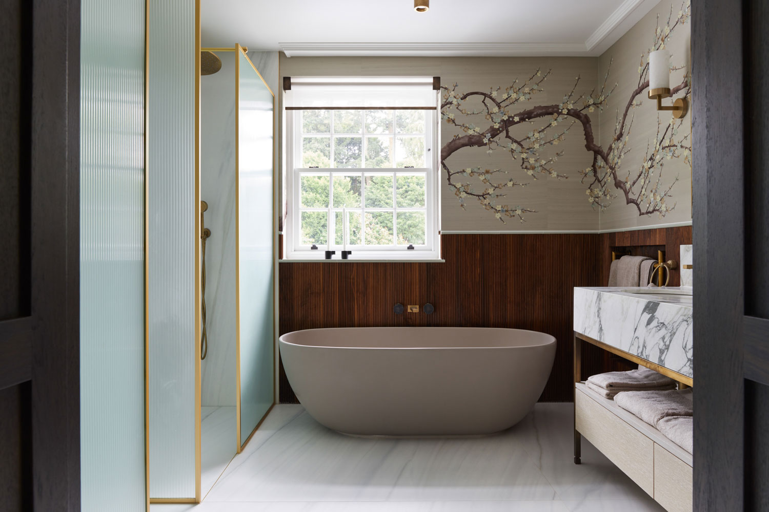Particularly noteworthy is the bespoke blind solution featured in the main bathroom. A fine, semi-transparent roller blind diffuses light while allowing the natural surroundings to remain subtly visible — a perfect pairing with the organic textures and Japanese-inspired mural behind the freestanding bath.