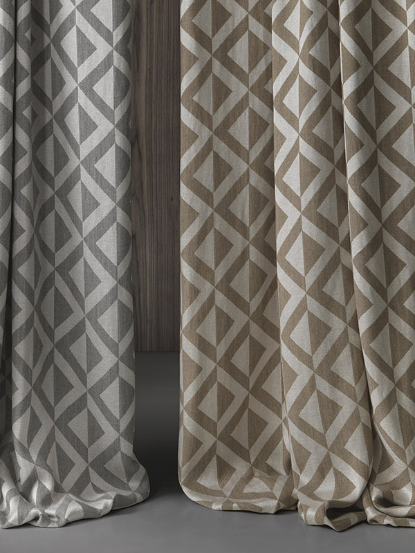 Jacquard with geometric pattern and slightly contrasting colours. Warm, neutral colours are combined with soft woolly appearance of natural yarns such as linen and wool. Full and flowing, perfect for decorative curtains.