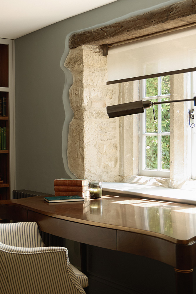 From the dining room’s soft, filtered light to the tranquil bedroom setting, every treatment contributes to an atmosphere that feels calm, refined and authentic to the building’s history.